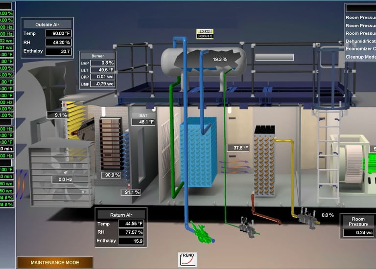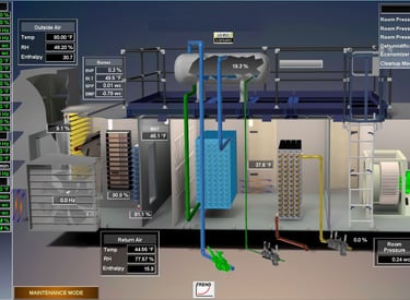 Interface of an air handling unit (AHU) displaying real-time airflow, pressure, temperature, and system controls.