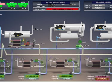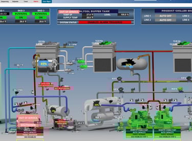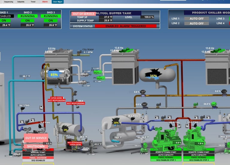 Glycol cooling system display showing buffer tank, chillers, pumps, pipelines, temperatures, pressures, and active alarms.