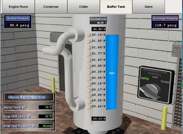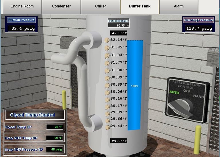 Buffer tank display showing liquid expansion level, glycol and ammonia temperature setpoints, suction and discharge pressures, and refrigeration control