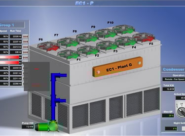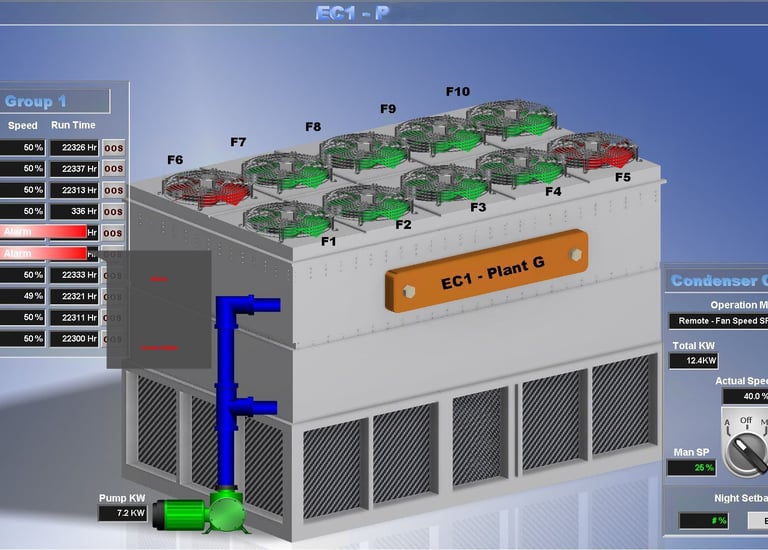 Condenser control interface showing multiple fans with power, speed, runtime, pump status, and active alarms for system monitoring.