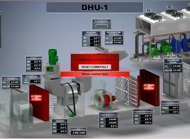 Control interface of a dehumidification unit (DHU) showing cooling coils, filters, fans, alarms, and fault indicators with real-time parameters.