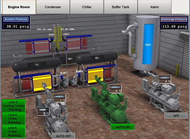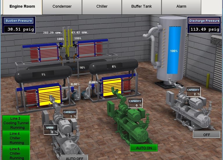 Visualization of an engine room showing chillers, pumps, buffer tank, and system pressures with real-time capacity and operating status.