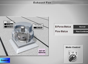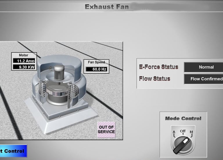 Exhaust fan interface displaying motor load, power consumption, fan speed, flow status, and mode control.
