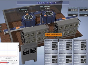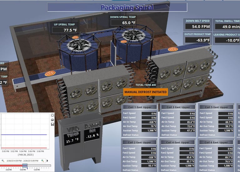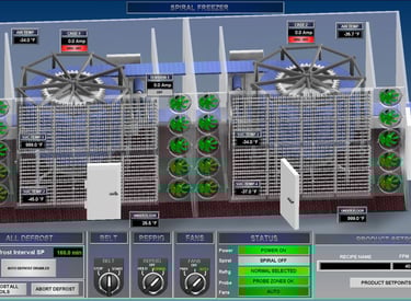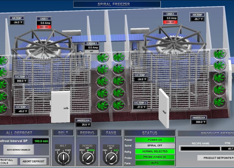 Spiral freezer interface showing conveyor belts, product temperatures, fan coils, and defrost controls with real-time operating data.