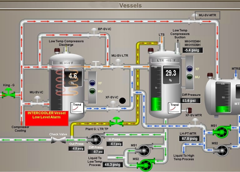 Diagram of interconnected vessels showing liquid levels, pressures, compressor suction/discharge, and active low-level alarms.