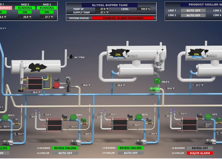 Ammonia refrigeration system display showing compressors, condensers, pumps, buffer tank, and piping with real-time temperatures, pressures, levels, and alarms.